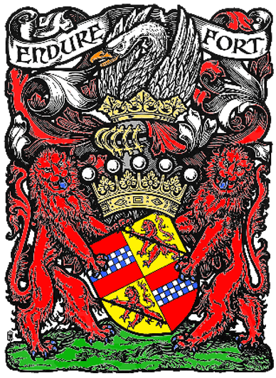 Supporters: Two Lions rampant guardant Gules, armed and langued Azure. The arms in the first and fourth quarters depict a silver and blue check pattern on a red background and in the second and third quarters a red rampant lion with blue tongue and claws on a gold field. Over each lion is a thin black stripe. Supporting the shield on a compartment are two red lions with blue tongues and claws. The crest features a white swan within a gold crest coronet, above a helm and coronet of suitable rank.