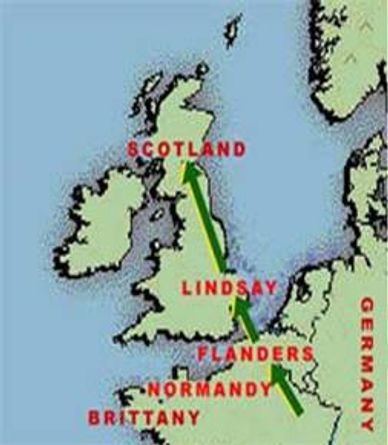Migration of Lindsay ancestors via the County of Flanders (900 AD), and via the administrative area of Lindsay in Lincolnshire (aft. 1066), to Scotland (bef. 1116). (After Lindesay, 2007)